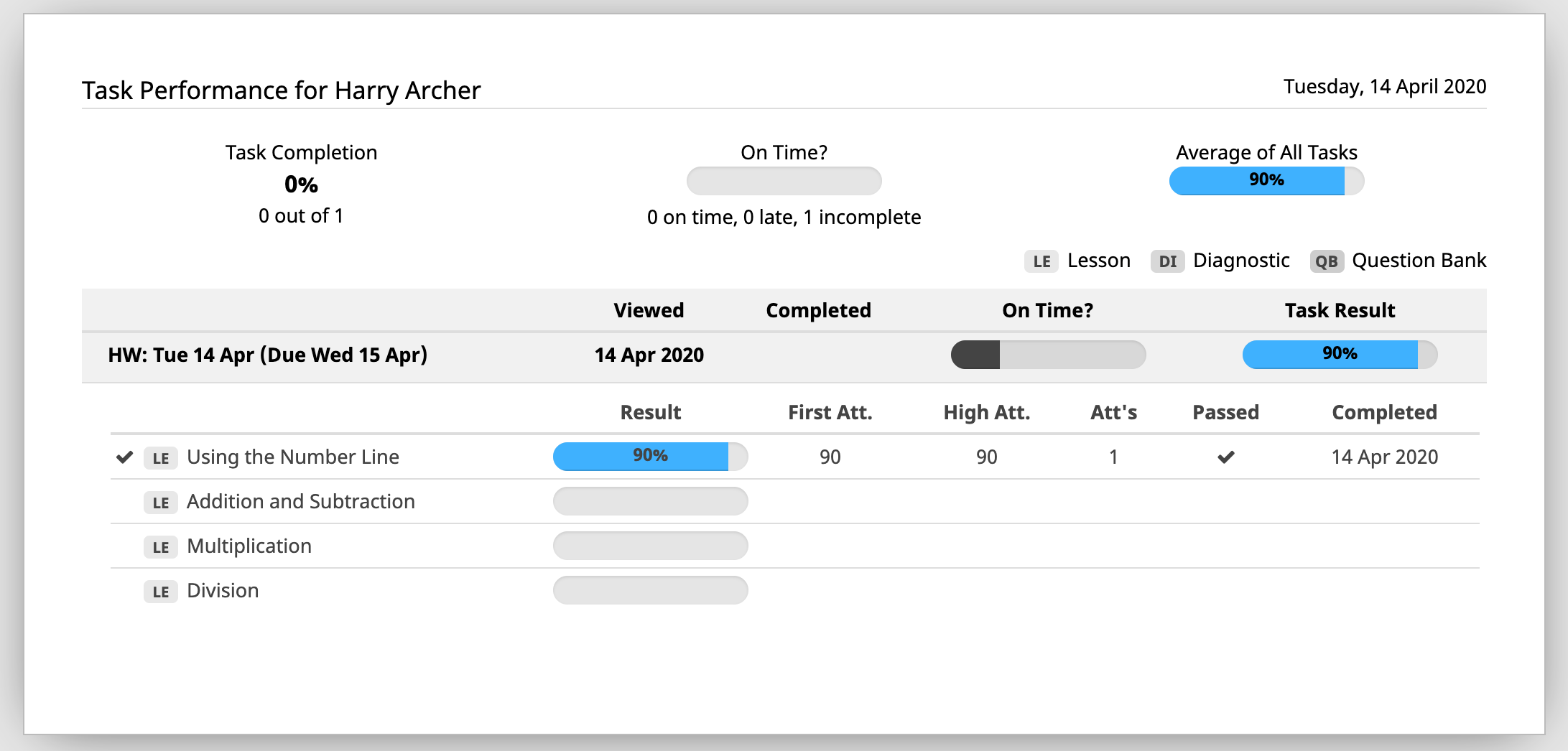 Once the task has been completed, a tick will appear in the Completed column for the student. The student results will also appear in the teacher's report for that task.